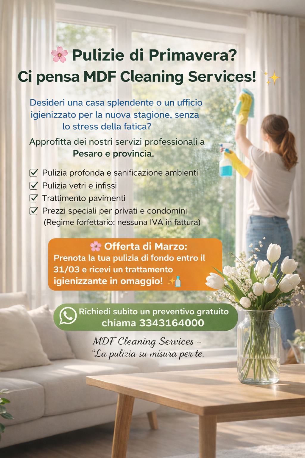 "✨ Pulizie Professionali a Pesaro? Approfitta dei vantaggi del nostro regime forfettario: nessuna IVA in fattura e massimo risparmio per privati e condomini."